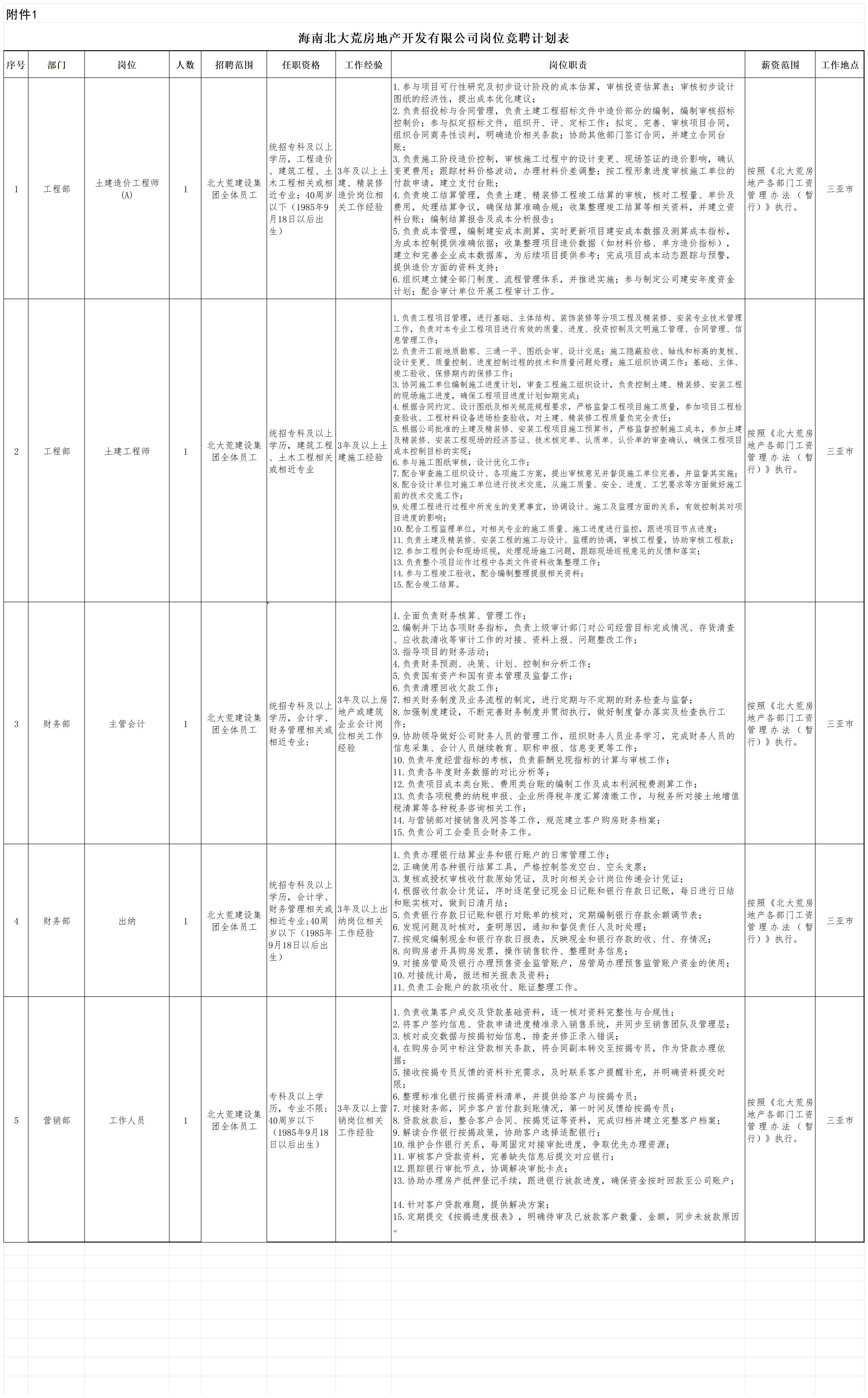 海南北大荒房地产开发有限公共计5个岗位。竞聘岗位、任职资格、工作经验及岗位职责等信息,详见《岗位竞聘计划表》(附件1)。