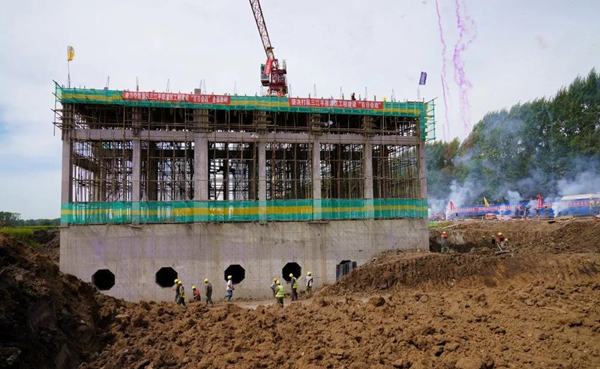 青龙山灌区一期中区工程中最大的单体建筑物——中南二干提水泵站喜封顶